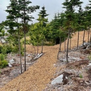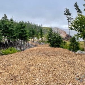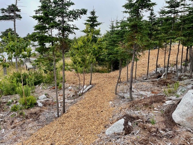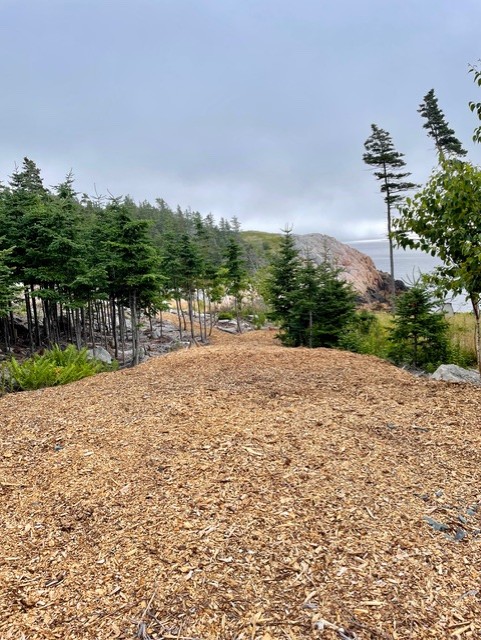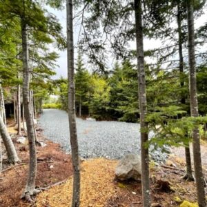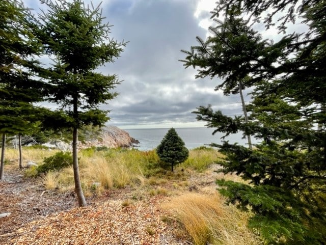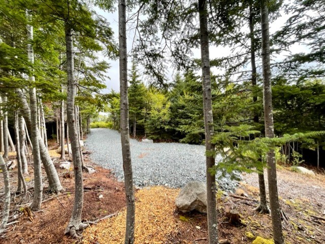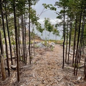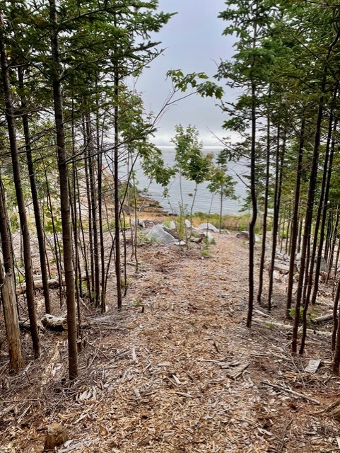 The landscape of this property is primarily evergreen and deciduous trees. If you choose, you can meander through a tree-lined path or walk the driveway to the beginning of ocean views. The contemporary-designed home plans maximize views with two stories plus an upper loft, floor-to-ceiling windows facing the ocean and Tribune Head. The entrance is on the second floor with surrounding decks. The upper level loft has a master bedroom, bathroom and a loft office or den. The lower floor has an above-ground walkout onto paths to the ocean. There are also plans for a one-story studio building with, again, a spectacular view of Tribune Head.