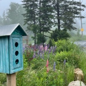 The property also has a “flag” portion fronting on Village Road. It is filled with wild flowers, specialty trees and has fenced access for additional vehicle or trailer parking. A small community lending library also makes its home here. Nestled on the point sit Anderondack chairs to relax in while capturing the sights and sounds of this magical place.